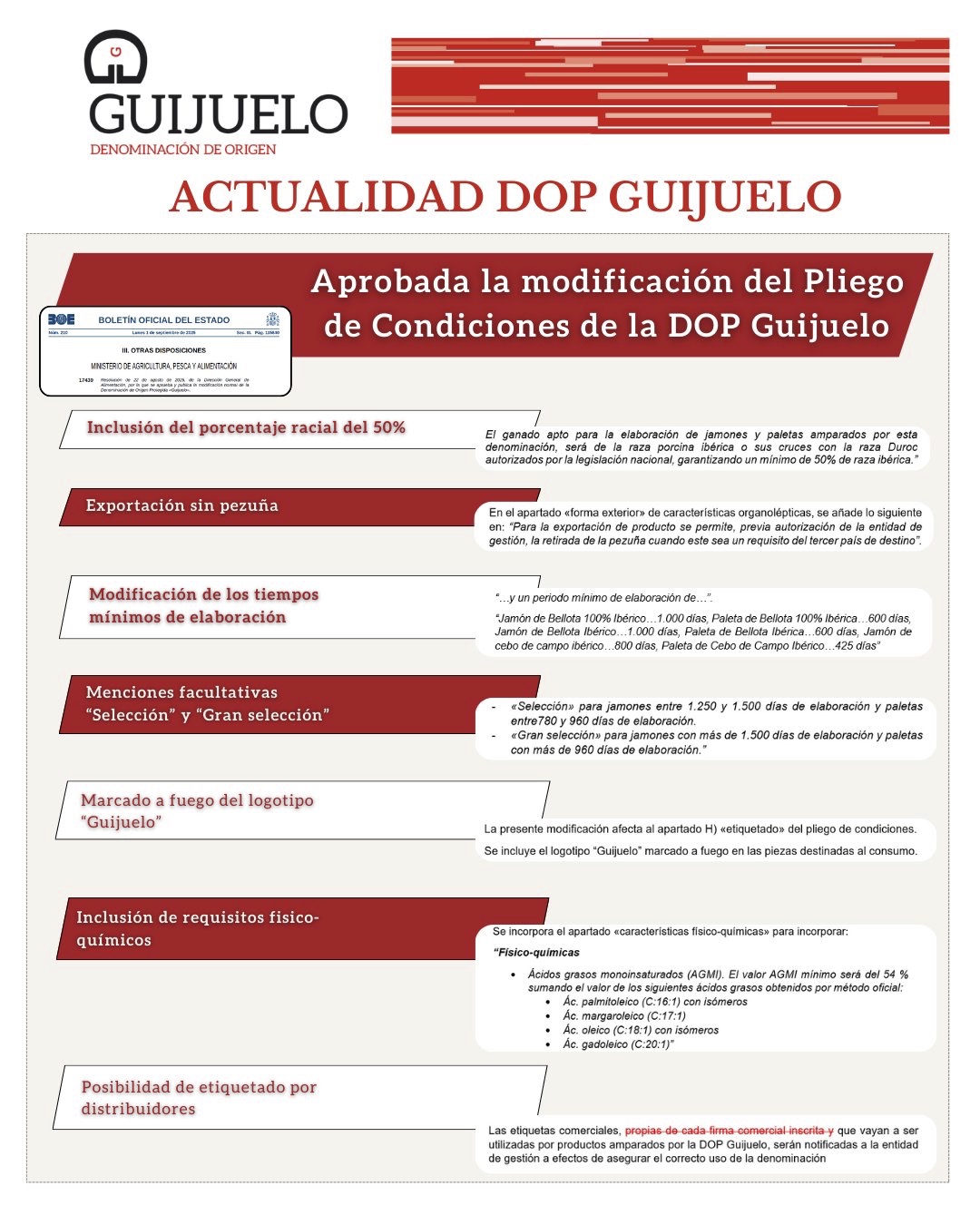 En septiembre de 2025, la DOP Guijuelo ha aprobado la modificación de su Pliego de Condiciones, con el respaldo de las autoridades competentes y su publicación en el Boletín Oficial del Estado. El objetivo es claro: reforzar las exigencias de calidad y adaptar la norma a la realidad de productores y consumidores