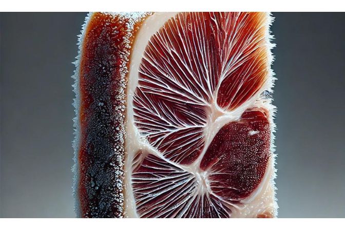 Durante il processo di congelamento, anche se in un prosciutto stagionato rimane poca acqua, si formano sempre dei cristalli d’acqua.