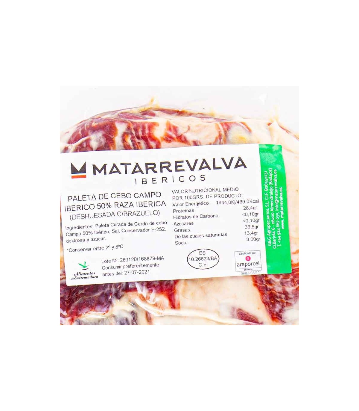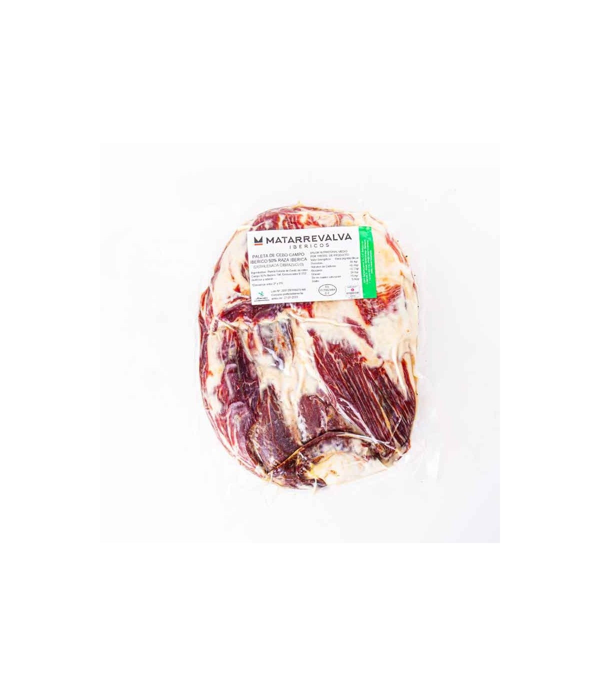 50% iberische Feldköderschulter ohne Knochen aus Extremadura von Schweinen, die mit Weiden, Kräutern und Früchten von den Matarrevalva-Farmen in Badajoz gefüttert wurden, ergänzt mit ausgewähltem Futter.