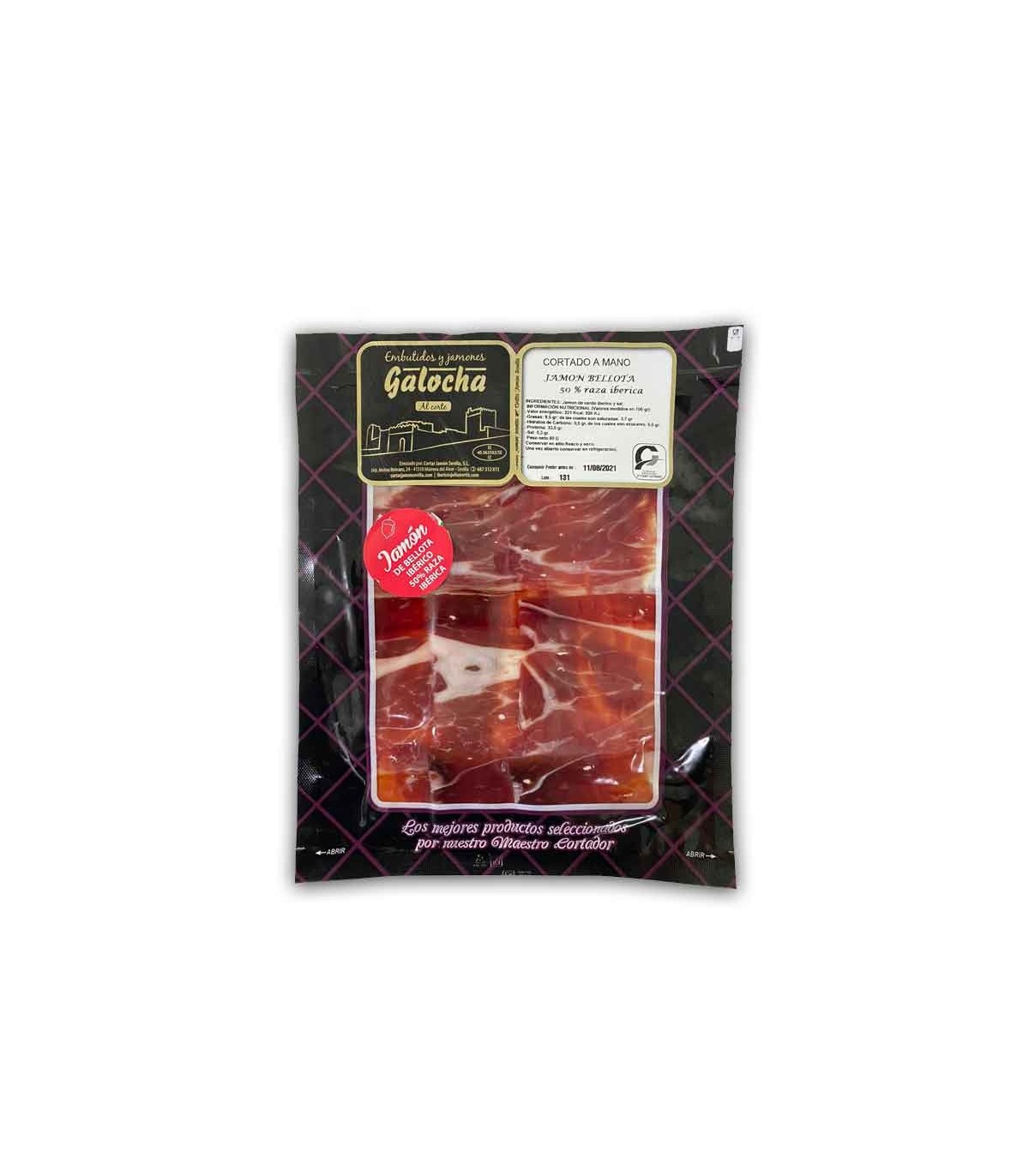 Sehen Sie sich mehr Produkte dieses Herstellers an50% iberischer Eichelschinken aus Sevilla, geschnitten vom berühmten iberischen Schinkenschneider Juan Ortiz, Mitglied des Nationalen Verbands der Schinkenschneider. Diese exklusiven Chargen, die unter der Marke Ibéricos Galocha hergestellt werden, stammen von iberischen Schweinen, die in Freiheit in Dehesas de Sevilla, Huelvanse und Extremadura aufgezogen und während ihrer Mast in Montanera mit Eicheln gefüttert wurden. Sie werden in 10 Beuteln à 100 Gramm angeboten, vakuumverpackt.