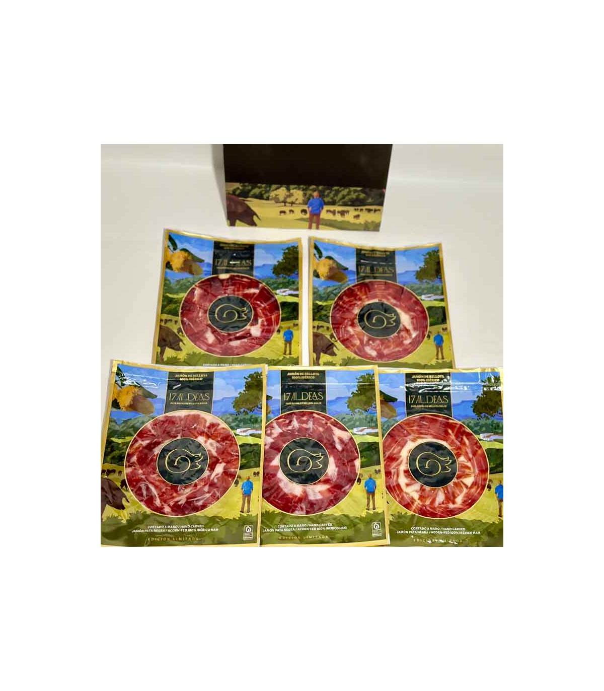 Der 100% iberische süße Eichelschinken mit geschützter Ursprungsbezeichnung g.U. Jabugo SUMUM 17 Aldeas ist einzigartig. Sie stammen von reinen iberischen Schweinen, die auf der Familienweide von La Lima aufgezogen werden, wo sie mit süßen Eicheln gefüttert werden.