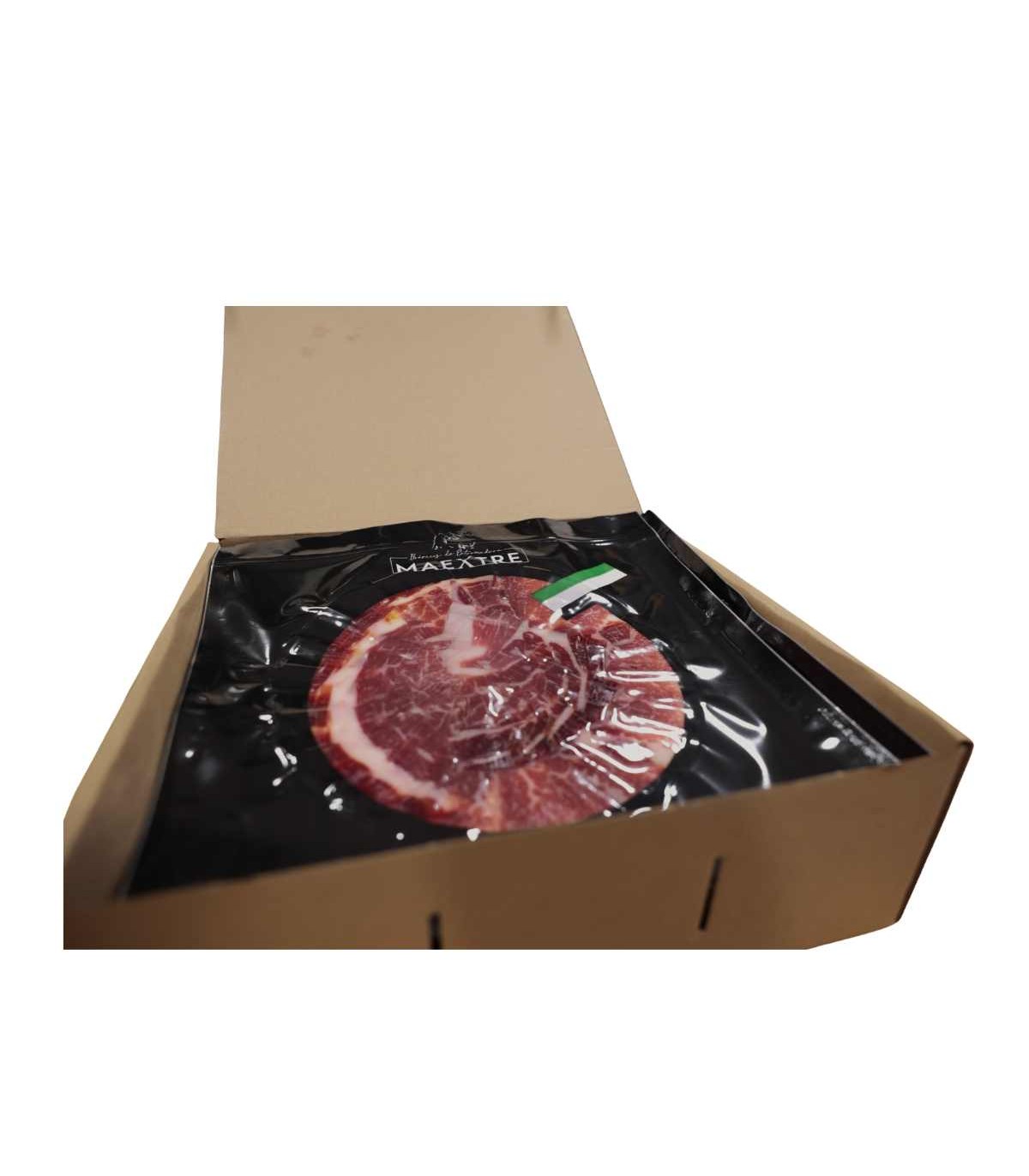 Découvrez l’exquis 100 %Jamón de Bellota Ibérico Maextre, originaire des pâturages d’Estrémadure. Découpé au couteau et prêt à servir. Il est disponible en 20 sachets individuels ainsi que ses taquitos et ses os.