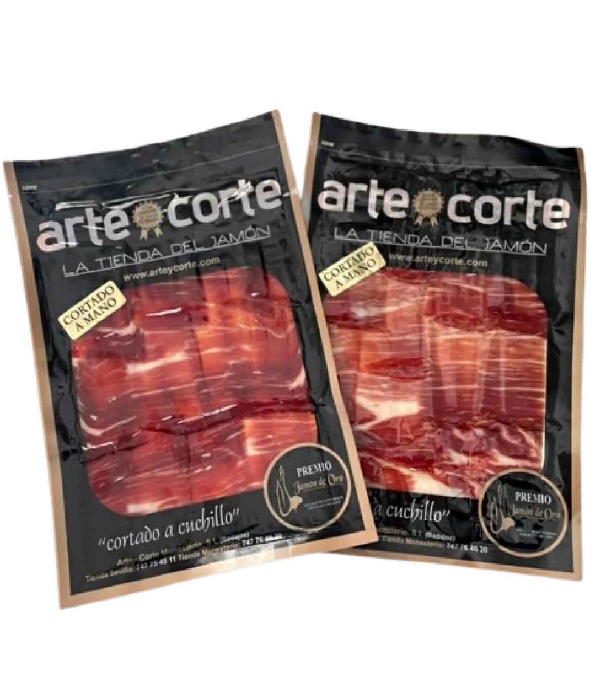 Pour vous faciliter la tâche, Arte Corte vous présente ce jambon déjà tranché au couteau et emballé sous vide en 20 sachets de 100 grammes à 8,32 €/sachet. Un total de 25 sachets prêts à être dégustés à tout moment. Découvrez avec votre palais pourquoi 100 % Ibérico Jamón De Bellota est l’un des aliments les plus exquis et les plus sains.