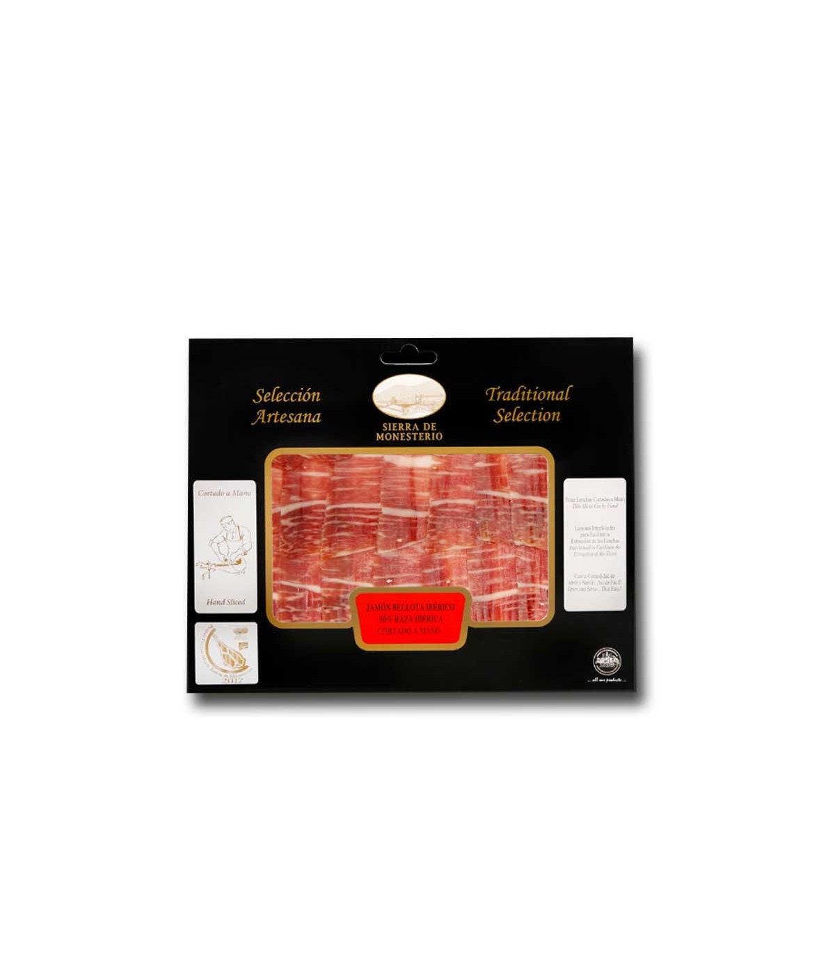 Ver más productos de este productorSliced from 50% Sierra Monesterio red label Jamón De Bellota ibérico , hand-cut into thin slices and vacuum-packed in 100 gram sachets. It comes from Iberian pigs reared in freedom in the pastures of Extremadura, fed on acorns and herbs during the montanera, and cured for approximately 36 months. Hand cutting by master cutters.