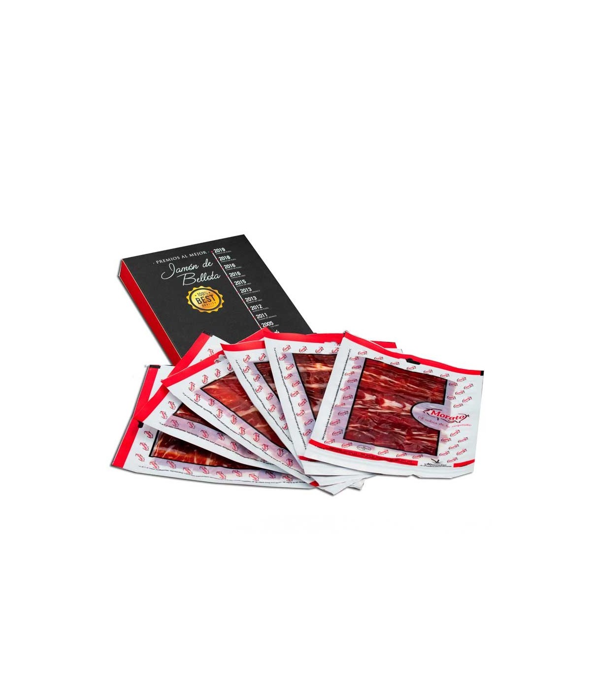 Jamón De Bellota 100% ibérico, cut with a knife into 100-gram sachets. Produced in Extremadura by Jamones y Embutidos Morato, an award-winning and leading jamón ibérico bellota manufacturer in Los Santos de Maimona, Badajoz.