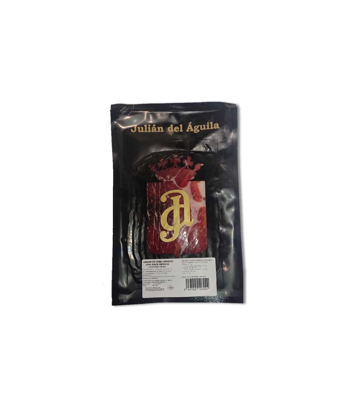 The 50% Iberian Sliced Cebo Ham from the renowned firm Julián del Águila is presented in vacuum-packed sachets of 100grs each.