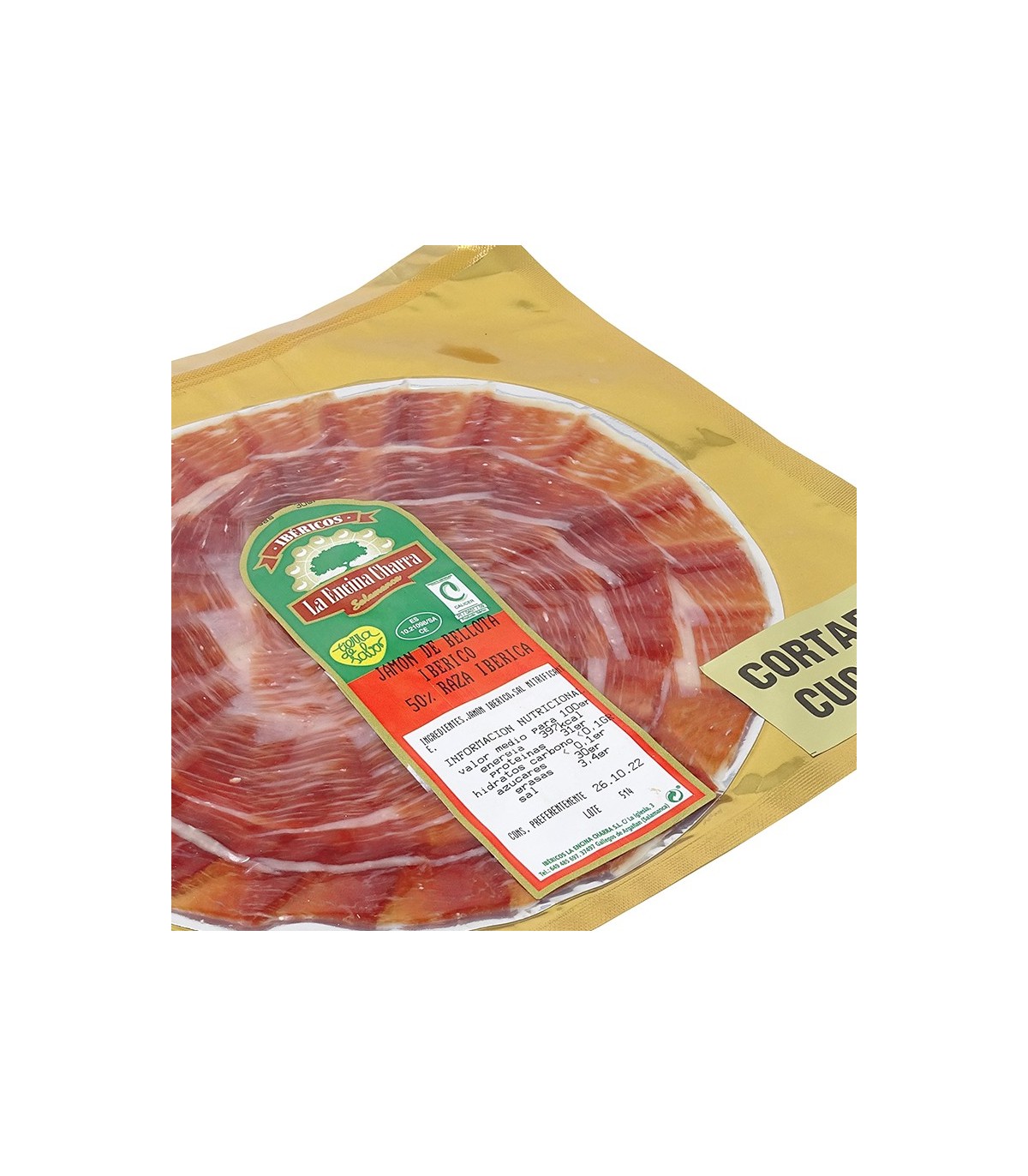 See more products from this producerAcorn-fed 50% Iberian ham sliced on the plate in sachets of 100grs.