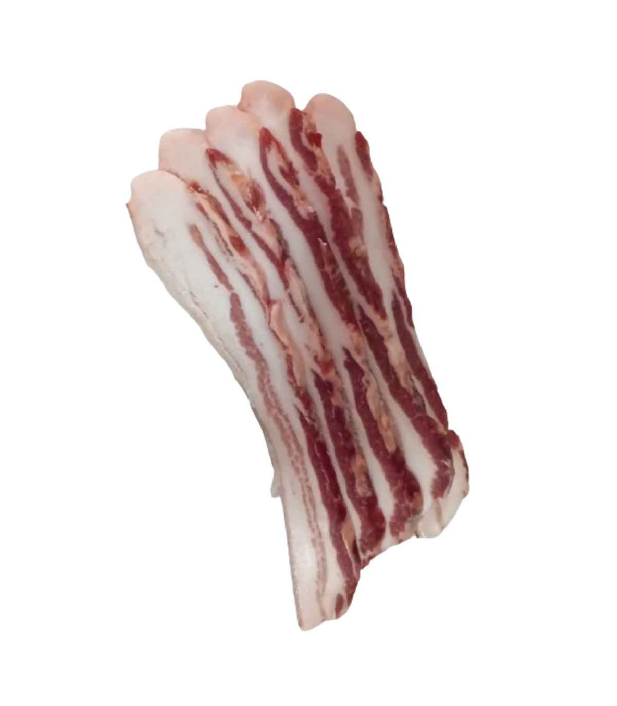 Un pezzo composto principalmente da grasso di maiale e una piccola parte di carne. Trattandosi di un maiale allevato in libertà con ghiande e pascoli dal pascolo, questa pancetta è di qualità suprema per le sue qualità contro il colesterolo cattivo ed è ricca di omega 3. È buono per stufare e per grigliare.