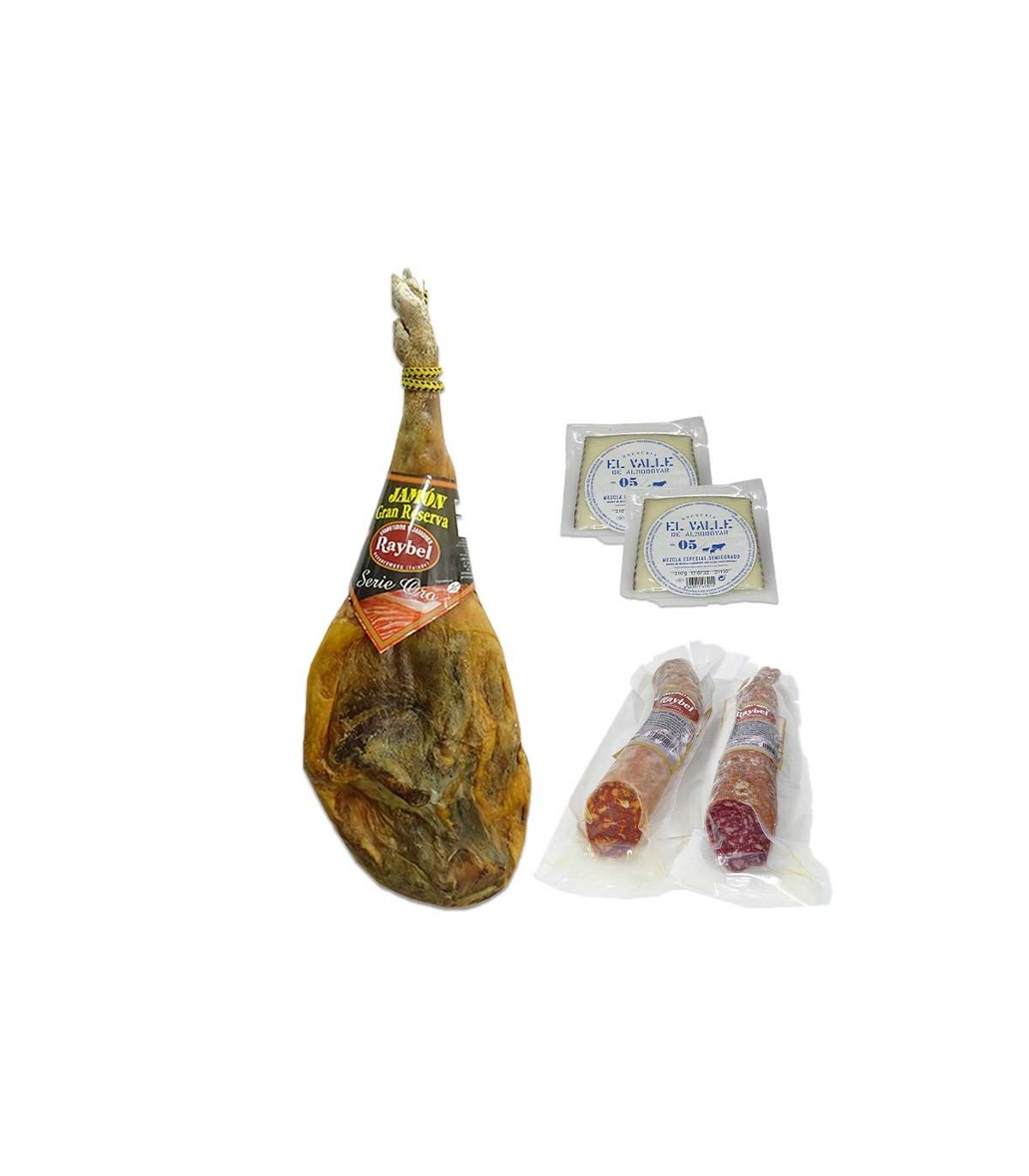 (El precio no incluye la posible decoración)1 Prosciutto Gran Reserva Serie Oro Raybel da 12 a 16 mesi di stagionatura e da 6.600 a 7.000 Kg.1/2 Chorizo Raybel iberico da 0,500 a 0,600 gr.1/2 Cular iberico Raybel Salchichón da 0,500 a 0,600 gr.2 spicchi di speciale formaggio semistagionato di El Valle da 0,210 gr./unità.
