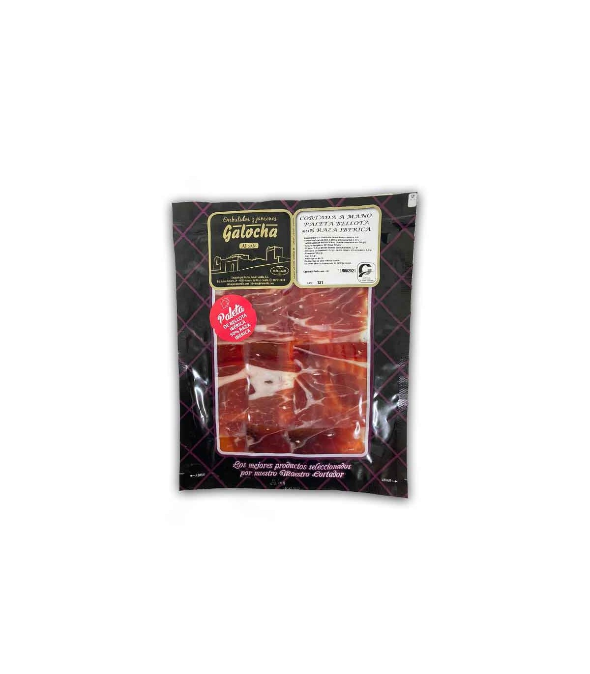 Ver más productos de este productorAffettare paleta di bellota 50% Ibérico di Siviglia con un coltello. Proviene da maiali iberici allevati nelle Dehesas de Sevilla, alimentati esclusivamente con ghiande. 1 bustina da 100 grammi cadauna, confezionata sottovuoto, si presenta ad un prezzo accessibile.
