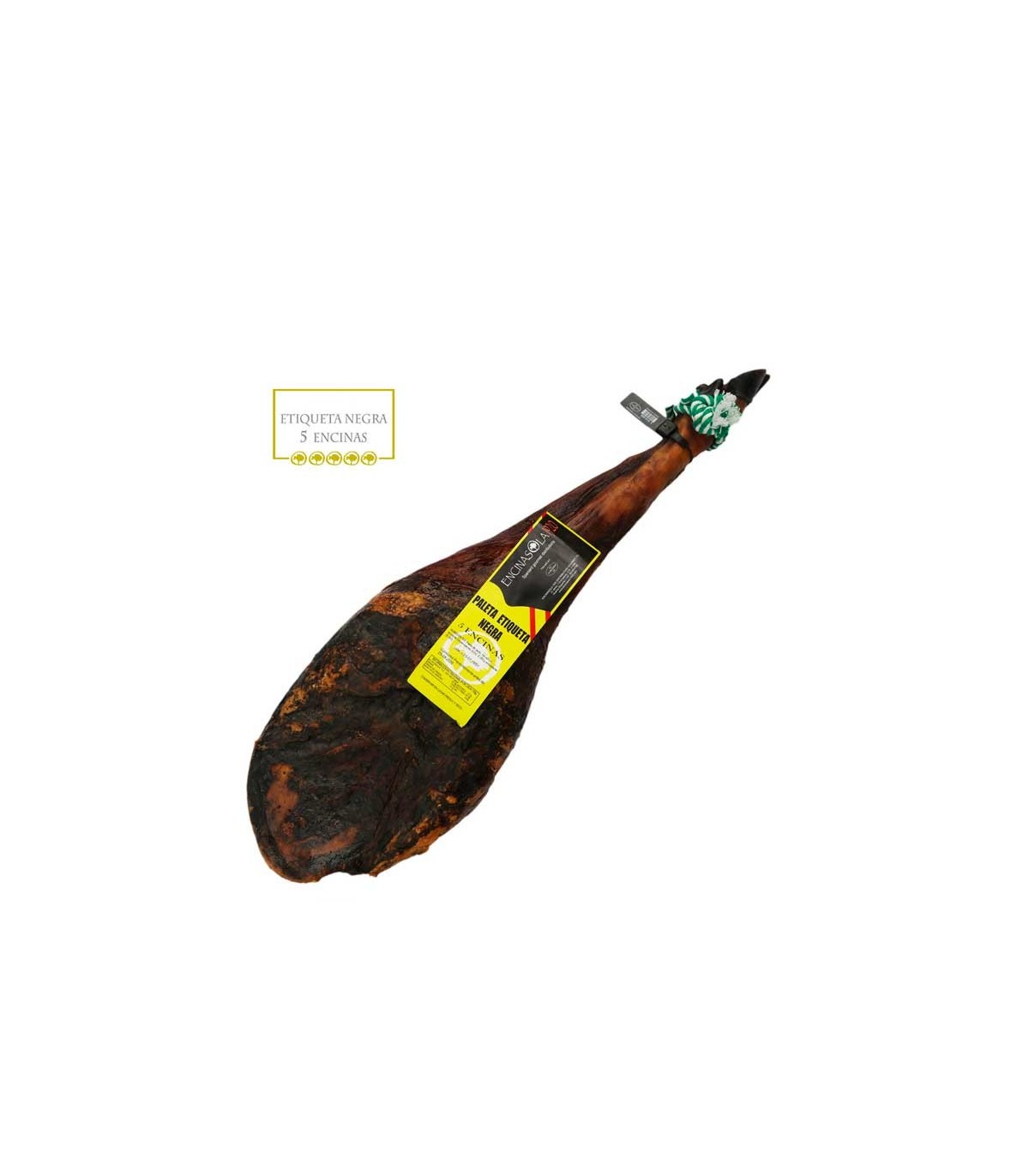 Paleta Etiqueta 5 Encinas Gran Reserva de ENCINASOLA1920: paleta squisito prodotto a Encinasola, Huelva, da maiali alimentati con risorse naturali e mangimi selezionati. Proviene da suini con genealogia selezionata. Questo paleta è classificato come "fuori standard".