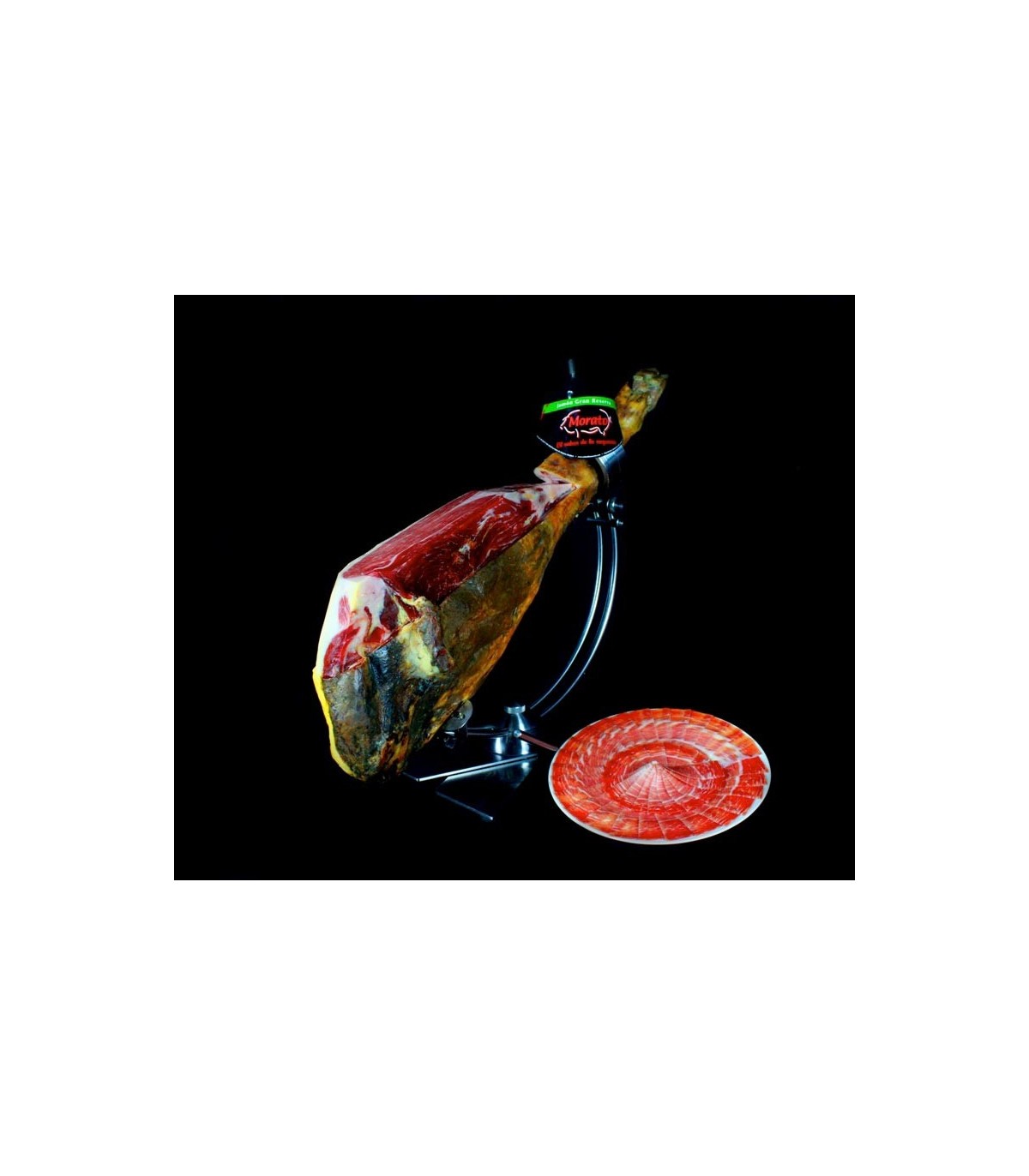 Este Jamón Gran Reserva procede de cerdos de capa blanca especialmente seleccionados y cruzados con DUROC alimentados a base de piensos y criados en las Tierras de Extremadura. Este sabroso jamón sigue el mismo proceso de elaboración y curación que el reconocido y premiado Jamón ibérico Morato.