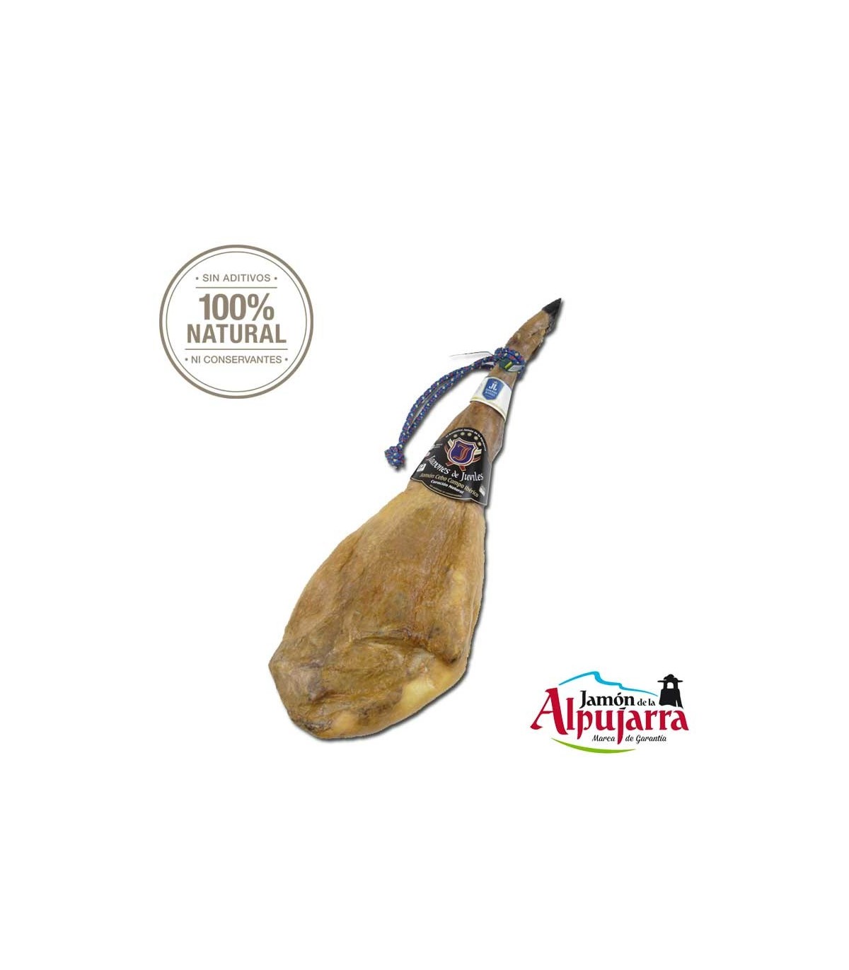 Jamón de cebo de campo 50% ibérico sin nitrificantes seleccionado por la familia Fernández desde Juviles, Granada. Elaborado al estilo tradicional en secaderos de curación 100% natural en Juviles, La Alpujarra. Sin aditivos ni conservantes, bajo en sal.