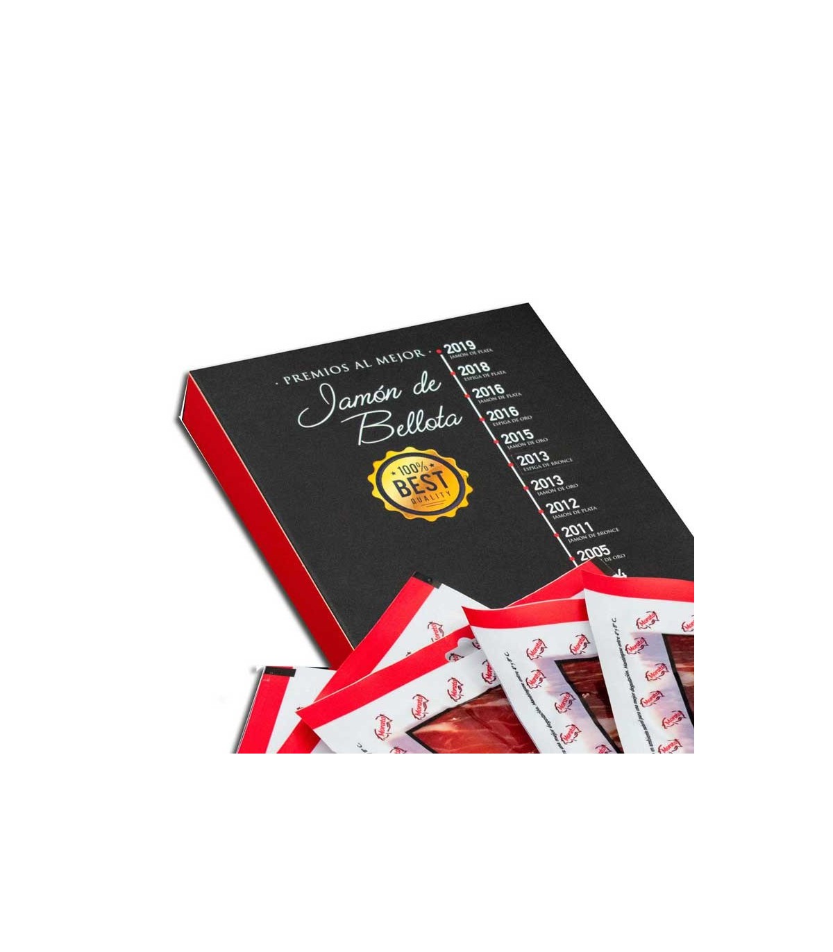 Jamón De Bellota 100% ibérico, snijd je met een mes in zakjes van 100 gram. Geproduceerd in Extremadura door Jamones y Embutidos Morato, een bekroonde en toonaangevende fabrikant van jamón ibérico bellota in Los Santos de Maimona, Badajoz.