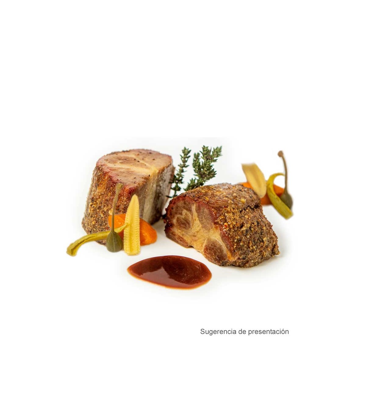 - 4 porções para 4 pessoas (300grs aprox. cada de carne + molho) de colarinho de porco ibérico feito sob a técnica pastrami, acompanhado de sumo de porco com legumes e vinho tinto Tempranillo, pasteurizado em bandeja selada pelo calor. Desenhado e elaborado no Restaurante o Eremita de Benavente (Zamora) "1 Estrela Michelin e 2 Sóis Repsol"