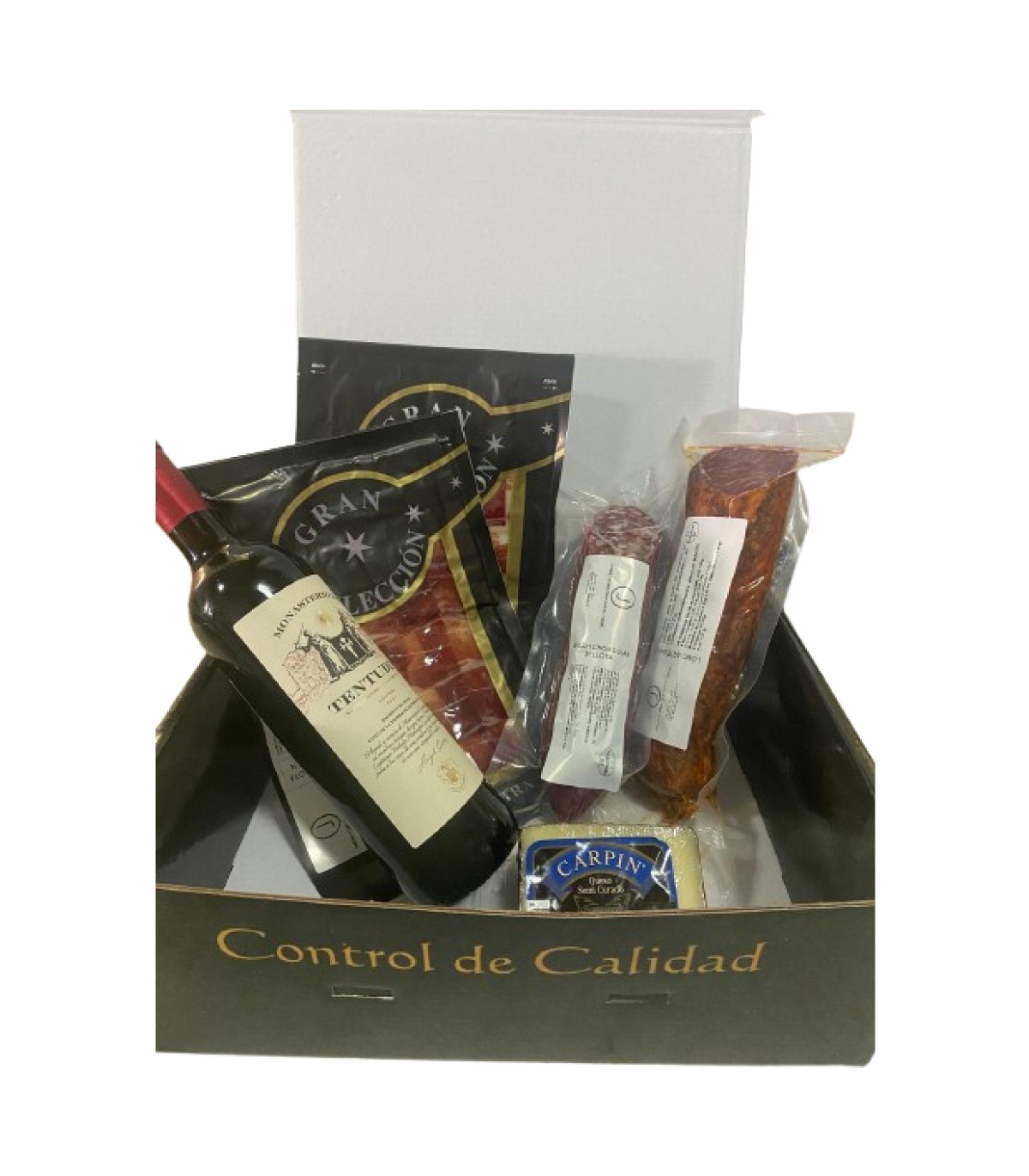 Desfrute do exclusivo Cabaz de Natal Premium de Presuntos e Enchidos García Cumbero, uma seleção de produtos ibéricos de alta qualidade, ideal para partilhar com a família, dar presentes ou deliciar o paladar nesta época natalícia. Este cabaz inclui salchichón de bellota, cerveja lomo gourmet, saquetas de presunto 100% ibérico bellota, uma garrafa de vinho Tentudiz e uma cunha de queijo artesanal, uma combinação perfeita para os amantes da gastronomia gourmet.