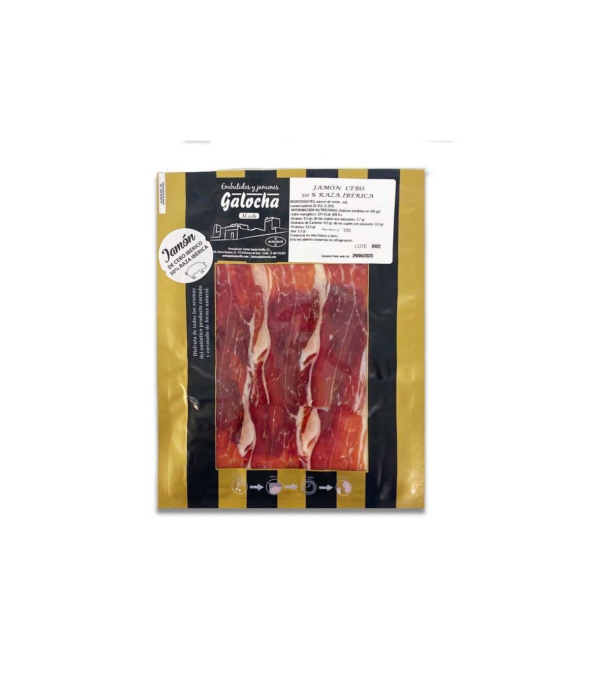 (O preço não inclui a possível decoração)FICHA TÉCNICA Presunto de isca fatiado 50% faca ibérica