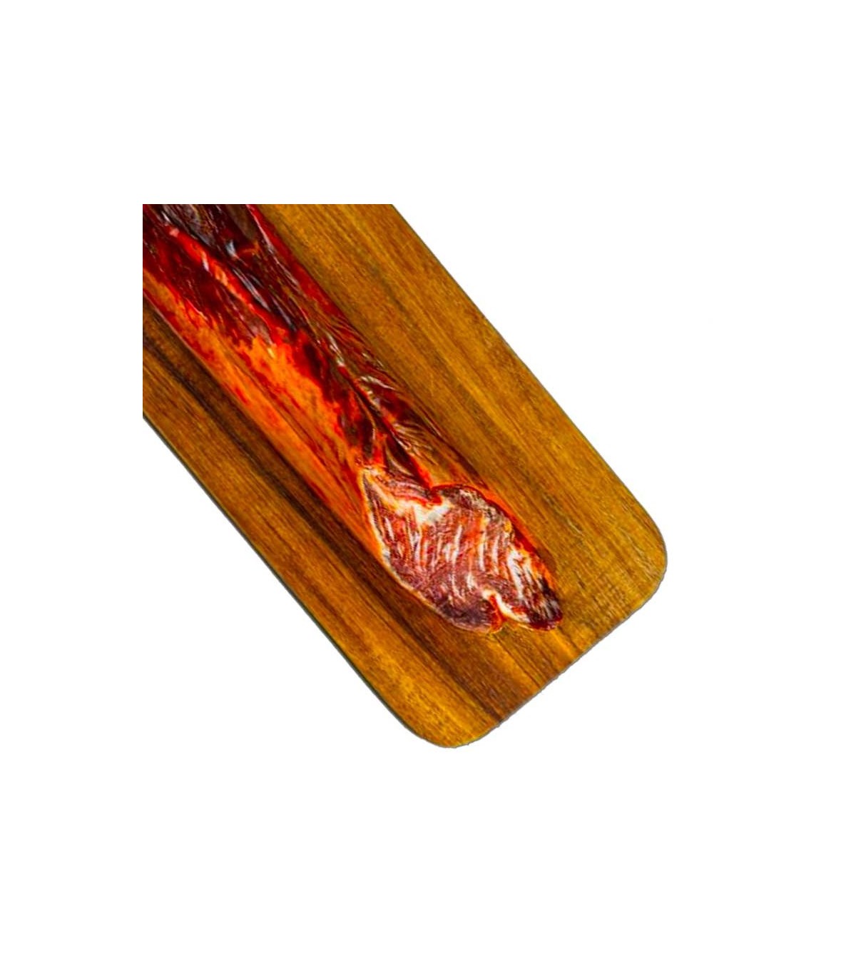 O delicatesă de Lomo cebo 50% Ibérico cu o textură mătăsoasă și topitoare, cu aroma caracteristică de boia și aroma nuanțată și cu note de nuci din grăsimea sa.