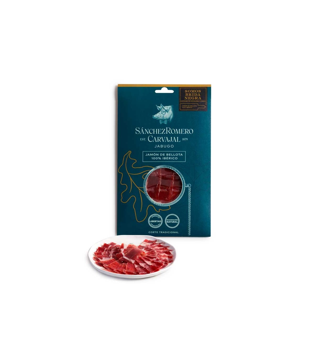 Șuncă 100% ibérico de la bellota Sanchez Romero Carvajal , prezentată în pliculețe de șuncă tăiate cu cuțitul ambalate în vid, astfel încât să vă puteți bucura de una dintre cele mai bune șunci din Spania împreună cu familia. O adevărată plăcere pentru simțuri.