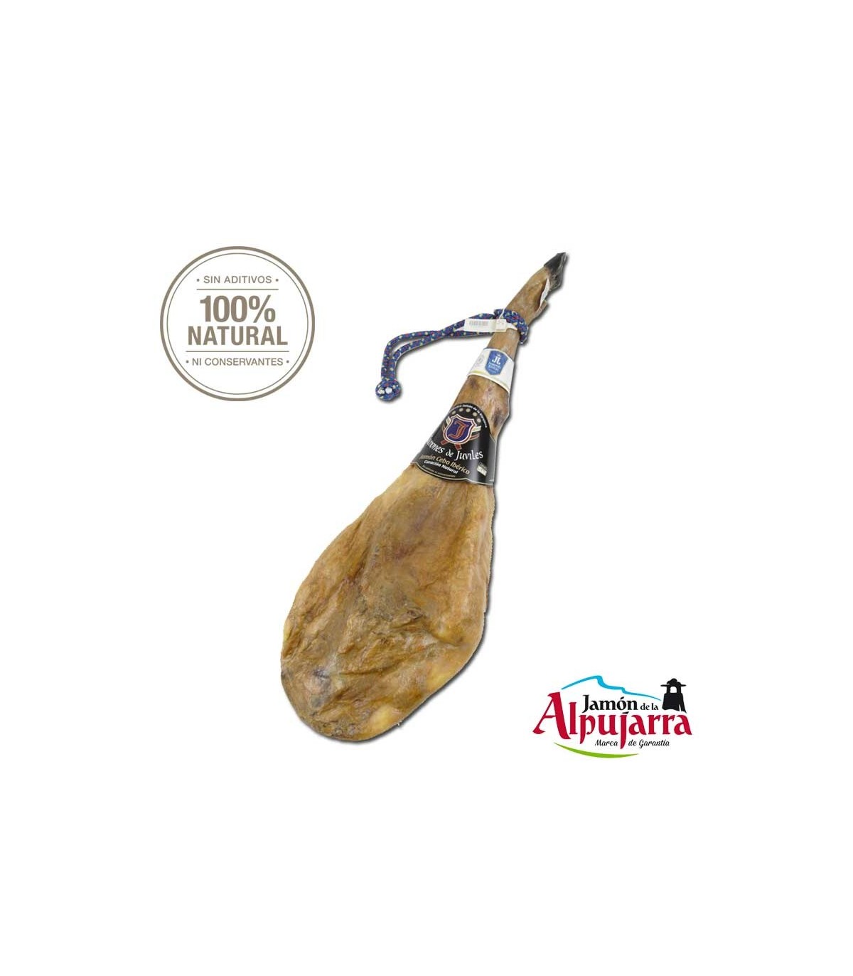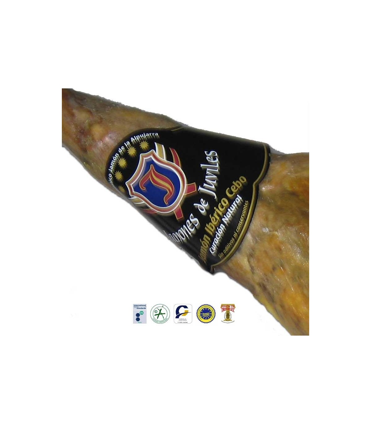 Jamón de cebo 50% ibérico fără agenți nitrificanți selectați de familia Fernández din Juviles, Granada. Fabricat în stil tradițional în magazii de uscare 100% naturale din Juviles, La Alpujarra. Fără aditivi sau conservanți, cu conținut scăzut de sare.