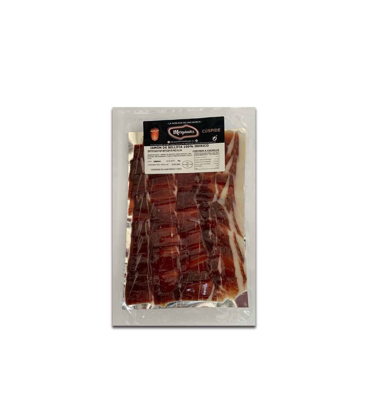 Șuncă 100% bellota Ibérico Pata Negra. 10 plicuri de șuncă pata negra în plicuri de 100grs. Șuncă uscată în repaus în magazii de uscare naturală și cu tăiere cu cuțitul de către maeștrii tăietori.